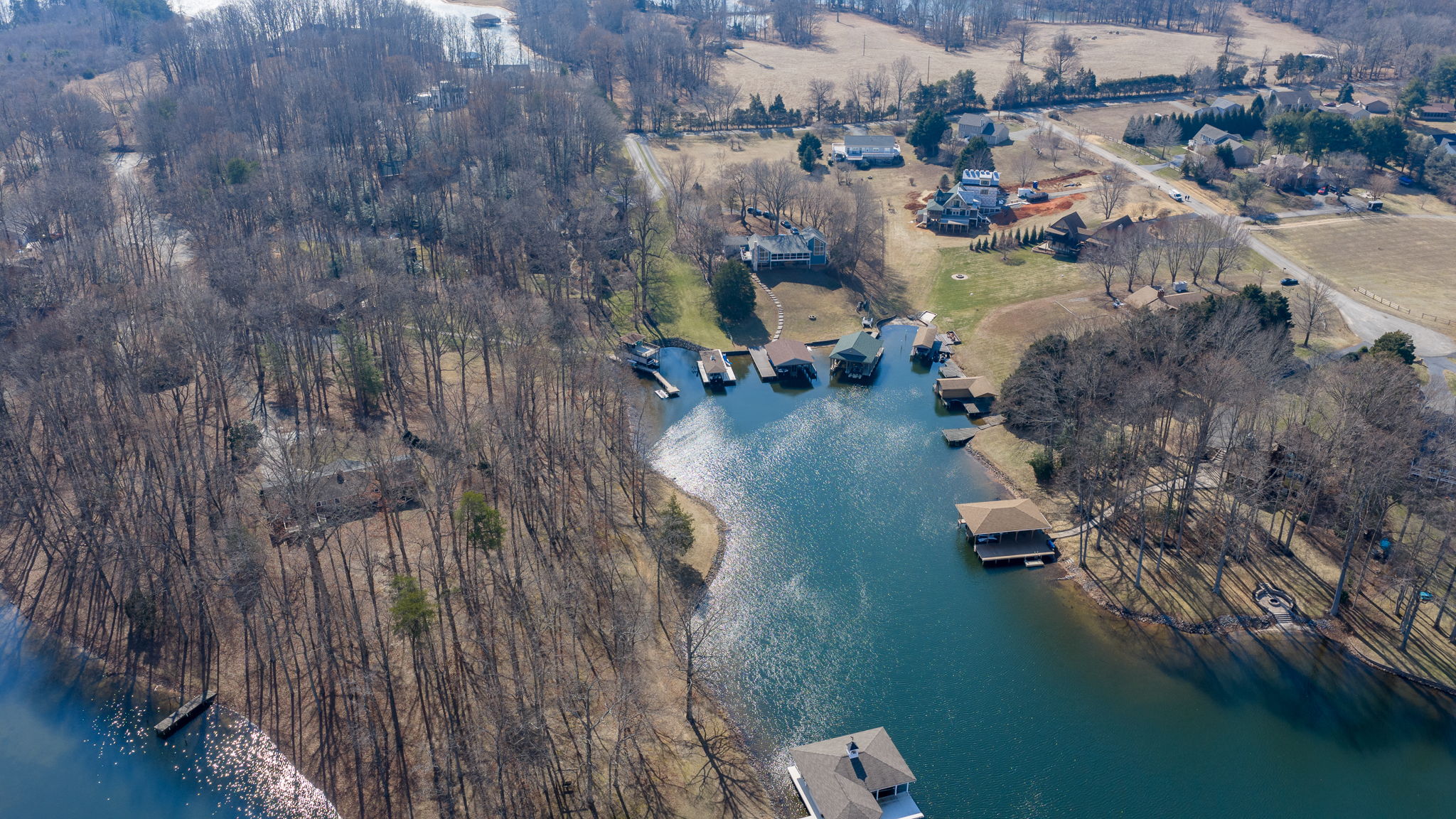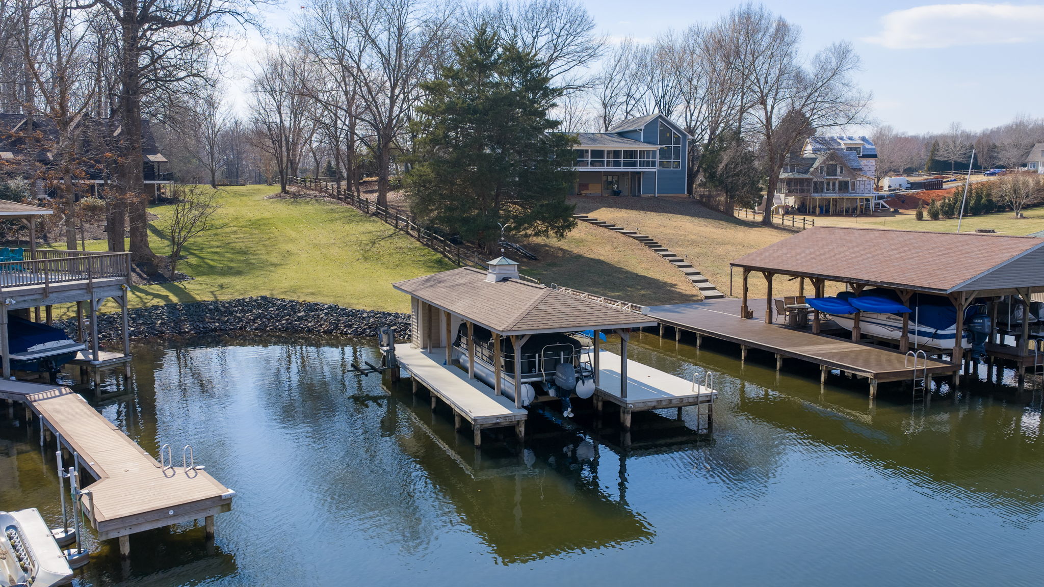 The great room is anchored by a stunning stone fireplace with gas logs, flanked by custom built-ins, and opens seamlessly to the expansive rear deck—perfect for morning coffee at sunrise or evening gatherings under the stars. The deck and front porch were upgraded in 2025 with composite decking and sleek aluminum railing, offering beauty with low maintenance. The kitchen has been stylishly refreshed with painted cabinetry, elegant quartz countertops, a newer refrigerator, and a cooktop island with breakfast bar seating—ideal for casual meals and conversation. A separate dining room captures peaceful lake views, making every dinner feel special. The main-level primary suite offers a serene escape with lake views, French door access to the rear deck, a walk-in closet with built-ins, and a private bath. Upstairs, a charming loft overlooks the great room and leads to two spacious bedrooms connected by a Jack-and-Jill bath featuring dual vanities and separate water closets—designed for comfort and convenience. The lower level was made for entertaining, complete with a family room, hickory cabinetry, a bar with refrigerator, and a large finished room currently used as a bedroom with its own full bath—ideal for guests after a full day on the water. Outside, the lifestyle truly shines. The gently sloping, level lot makes access to the lake effortless. Wide open views but quiet cove. An irrigation system drawing from lake water keeps the grounds vibrant all season long. Down at the shoreline, your single-slip boathouse offers excellent water depth, built-in storage, a heavy-duty boat lift, jet ski lift, retractable shade, and ample decking for lakeside gatherings.